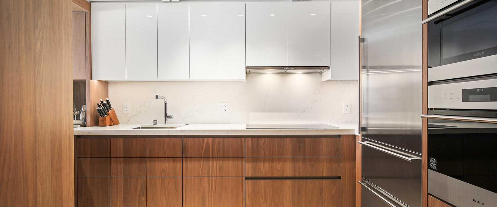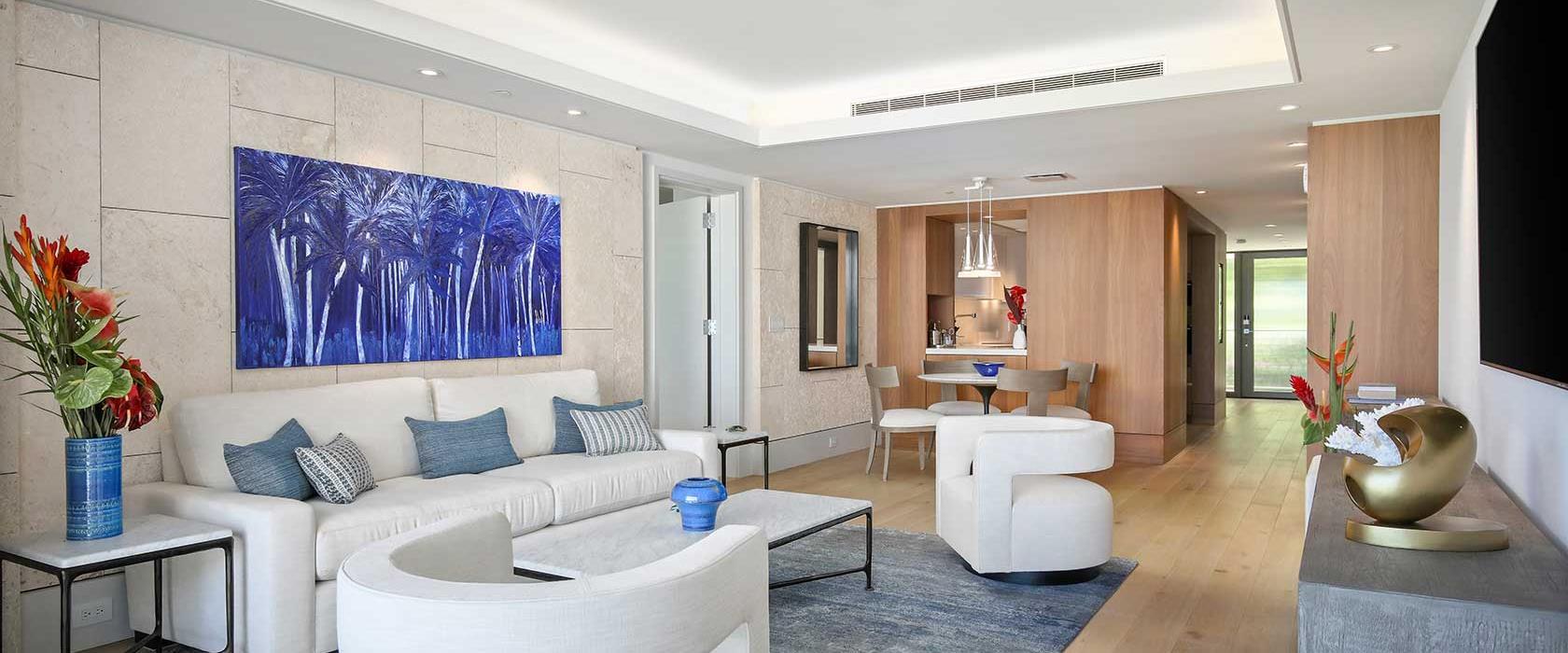 This unit also includes a fully equipped chef’s kitchen with Wolf, Sub-Zero, and Miele appliances. The master and living rooms each offer a desk for those that need to work remotely. An Asko washer/dryer, central air conditioning, and complimentary high-speed WiFi (> 100Mbps up/down) create all the comforts of home. For entertainment, the living room includes an 85” Samsung Smart TV with multiple streaming services. The master and second suite each have the same TV model with 75” and 65” screens, respectively.