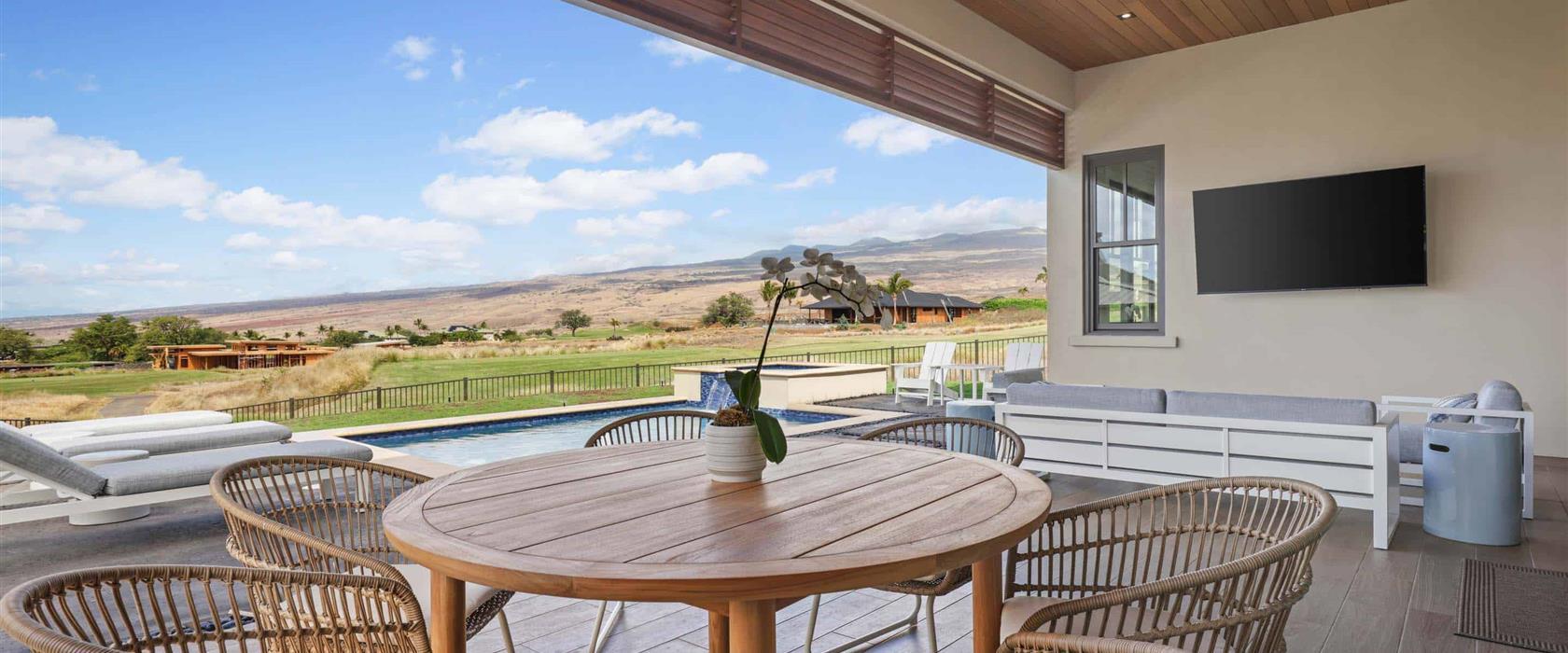 Nestled in an exclusive enclave of Mauna Kea Resort, Amaui Villa 5 embodies Hawaiian luxury with breathtaking ocean views and thoughtfully crafted spaces. The gourmet kitchen, featuring premium appliances and natural stone countertops, flows seamlessly into the dining and living areas, while the lanai invites relaxation with a dining table for six, a cozy TV lounge, and a gas BBQ. This exceptional villa offers four guest suites: the main house includes a primary suite with a king bed, outdoor shower, and standalone tub; a secondary suite with two queens; and a third suite with a twin bed with trundle and a double bunk bed. Above the garage, the fourth suite provides a private retreat with a king bed, a twin sleeper, and an ensuite bath. Outside, guests can unwind by the private pool, spill-over hot tub, and lanai, all framed by stunning Pacific Ocean views.
