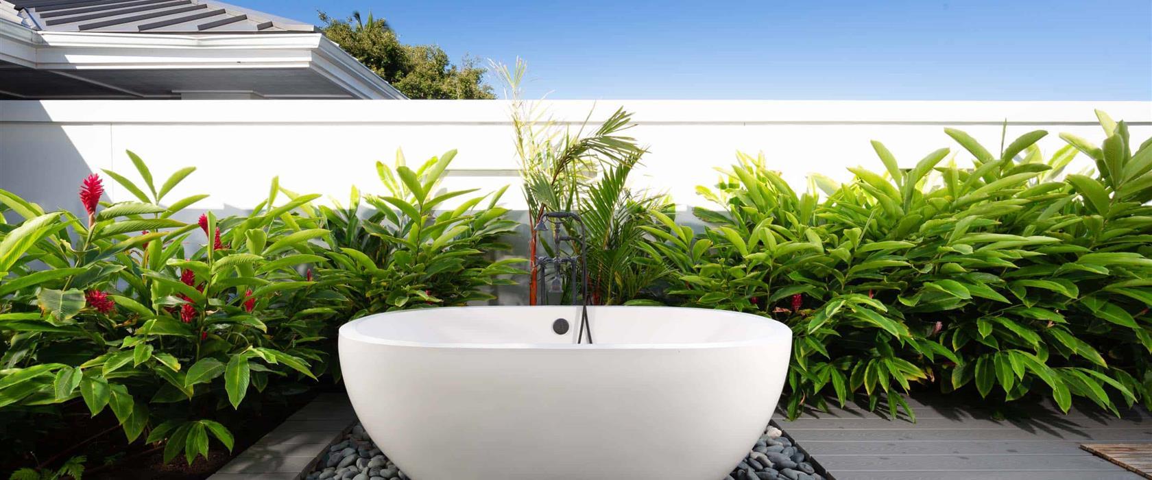 Walk down the stairs to the guesthouse, where you'll find a private lap pool and inviting chaise lounges. The guesthouse offers further private offerings with a queen bed, queen sleeper sofa and kitchenette and an ensuite bathroom that extends out to a lounge area and outdoor shower.