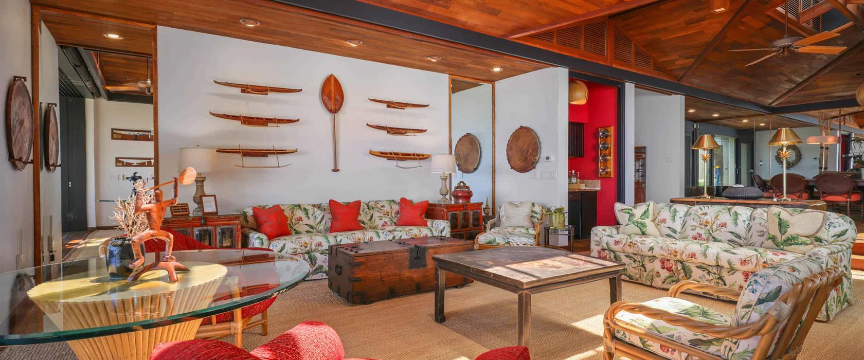 This oceanview estate has been crafted with impeccable design and finishings, and is a true island masterpiece offering a great room with sliding glass pocket doors for indoor/outdoor Hawaiian living and pitched ceilings clad with skylights and rich hardwoods; an epicurean kitchen outfitted with Viking professional-series appliances, slab granite countertops and an eat-in island for four; a magnificent dining room for eight, complimented by a breakfast niche for four. Additional features include: five guest suites, each with a flatscreen TV and attached, luxurious bathroom (primary and secondary have ocean views, a king size bed and relaxing sitting area), a laundry room, air conditioning and ceiling fans, plus a one-car garage brimming with water toys, folding chairs, a cooler and utility wagon— everything needed for a perfect beach day.