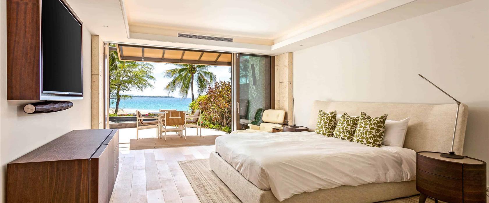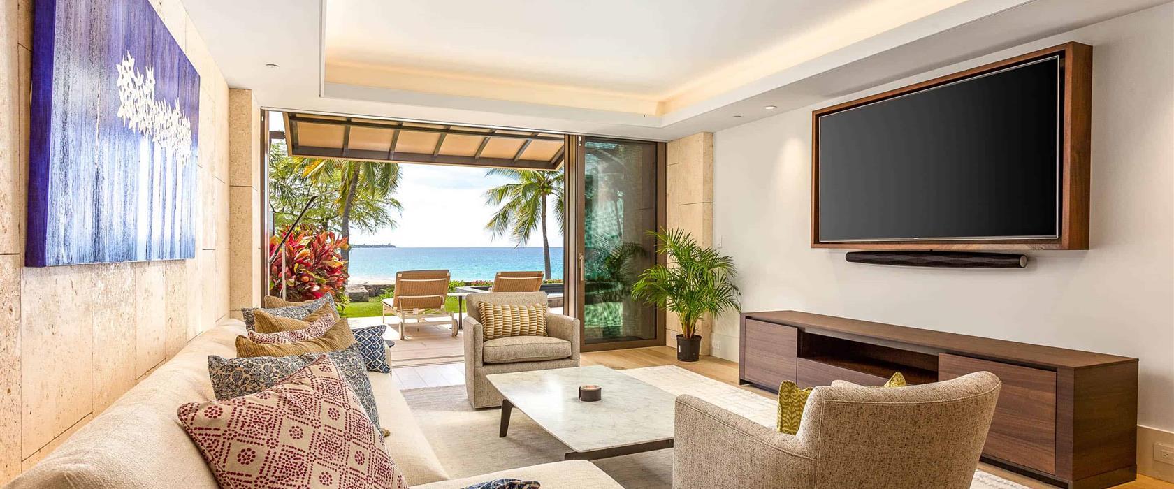 Experience oceanfront living at its finest in this ground-level masterpiece featuring floor-to-ceiling sliding glass walls that seamlessly blend indoor and outdoor spaces and frame breathtaking ocean views. The gourmet kitchen is designed for both beauty and function, with solid surface countertops, Sub-Zero refrigerator with icemaker, Wolf oven, microwave, and induction cooktop. The dining table seats four comfortably, and the living room offers a large sectional sofa and additional swivel chair. The serene primary suite features a king bed and a luxurious spa-style bathroom with marble double vanity, glass-enclosed rain shower with handheld showerhead, and Toto washlet bidet/toilet. The second bedroom has a queen bed and is conveniently located near a second full bathroom with marble vanity, glass-enclosed rain shower and Toto washlet bidet/toilet. A cozy bonus room with a daybed provides extra space ideal for children or teens. Enjoy modern comforts including air conditioning, Asko washer and dryer, and a private heated plunge pool on the furnished lanai with lounge chairs, umbrella, and outdoor dining for four.