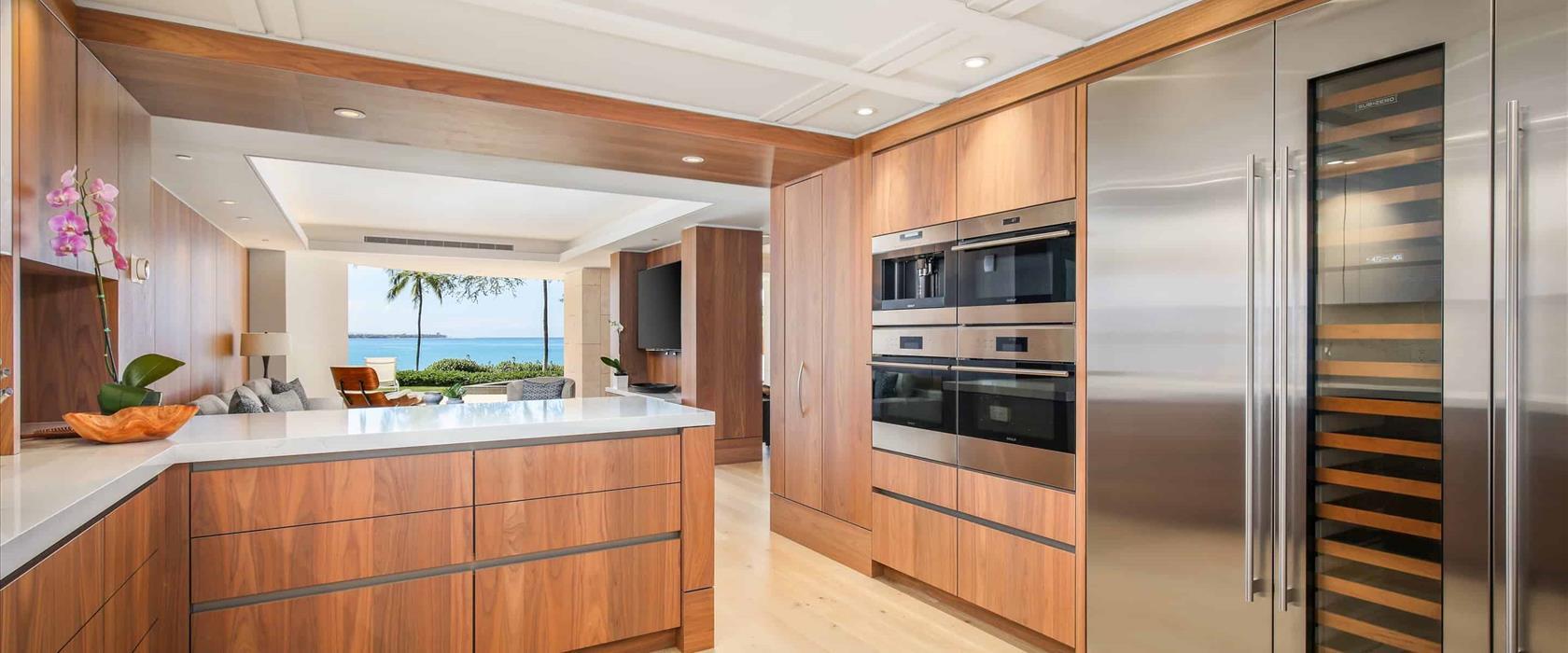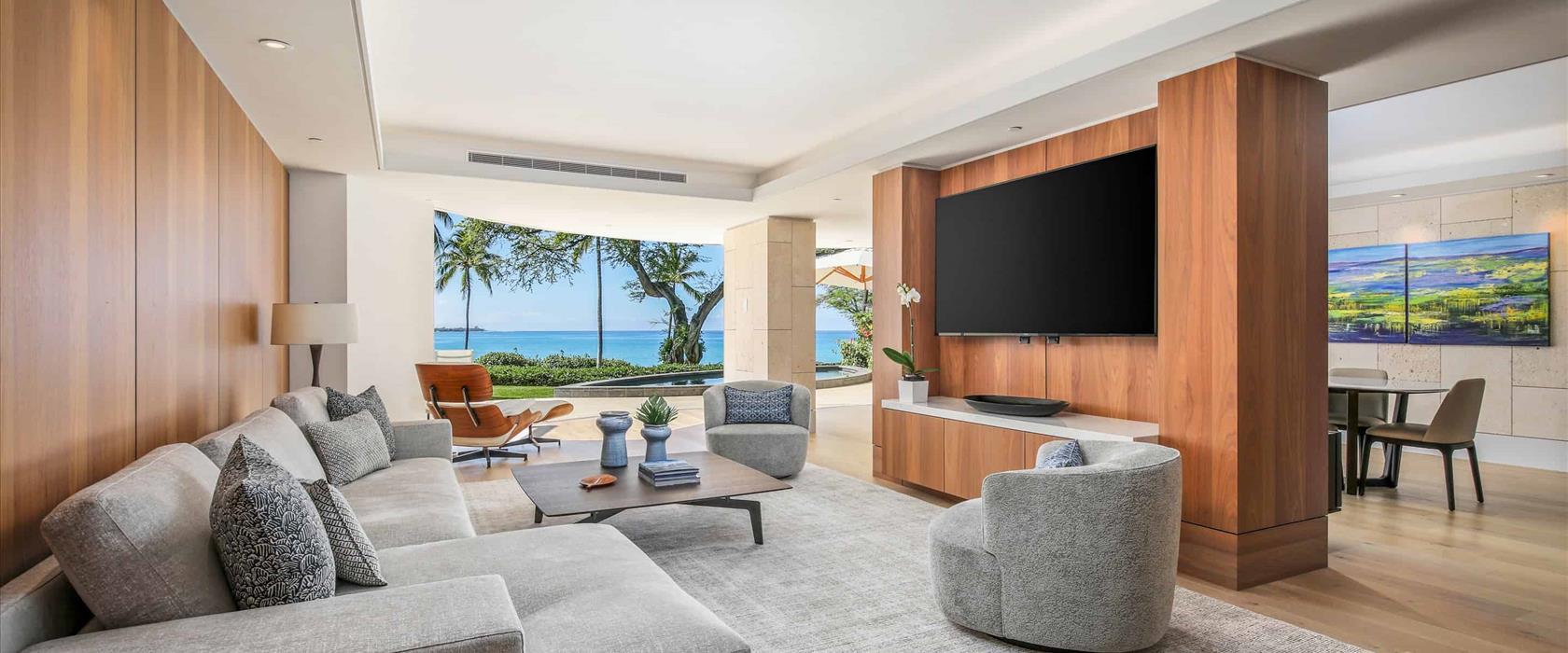 This ultra-luxe, oceanfront, newly-constructed, island masterpiece seamlessly fuses the blissful convenience of ground-floor beach access with exceptional privacy and space. This residence showcases floor-to-ceiling sliding window walls, a discriminating chef’s kitchen outfitted with professional-series Wolf, Sub-Zero and Miele appliances, including double ovens and wine storage, as well as a dining area for eight. Additional features include three guest suites, each with an attached, lavish bathroom (the first has a king size bed and sitting area, the second has a king size bed, the third has a queen size bed and desk/work space), a fourth bedroom with a queen size bed, air conditioning, an additional, dedicated desk/workspace, a laundry room with Asko washer/dryer, a private plunge pool and expansive 1,800+ square foot, handsomely-furnished lanai. This residence is steps from the Hapuna Golf Course Clubhouse.