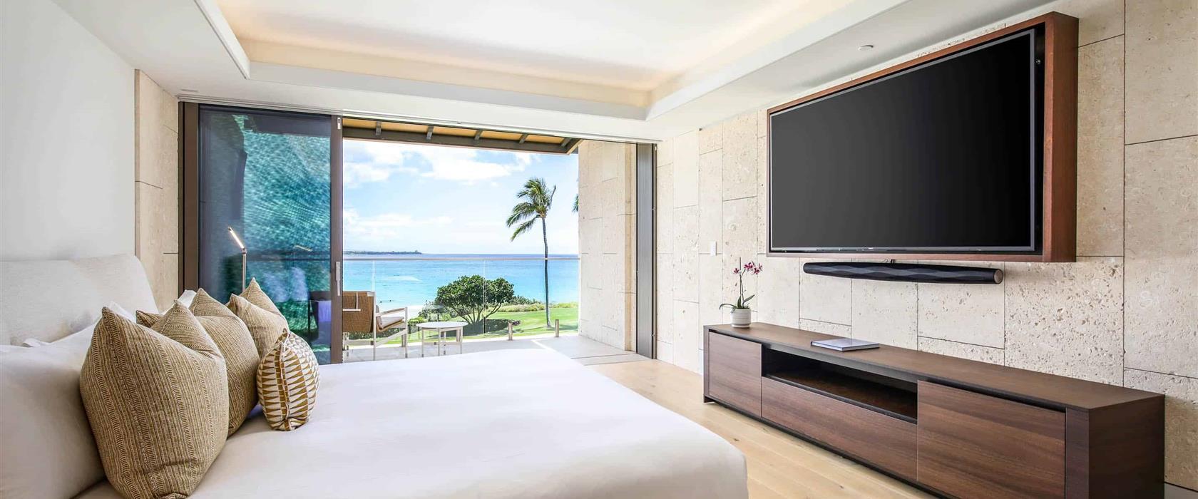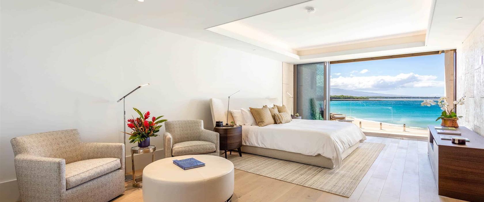 This island contemporary, oceanfront, newly-constructed, second level studio offers floor-to-ceiling sliding window walls that create indoor/outdoor living space, a gourmet kitchen outfitted with professional-grade Wolf, Sub-Zero and Miele appliances, wine storage and hand-crafted cabinetry. Additional features include a retreat-like, attached bath and sumptuous king size bed, Asko washer/dryer, air conditioning and lanai. Guests will savor wonderful, unobstructed ocean vistas and this residence is steps from the Hapuna Golf Course Clubhouse.