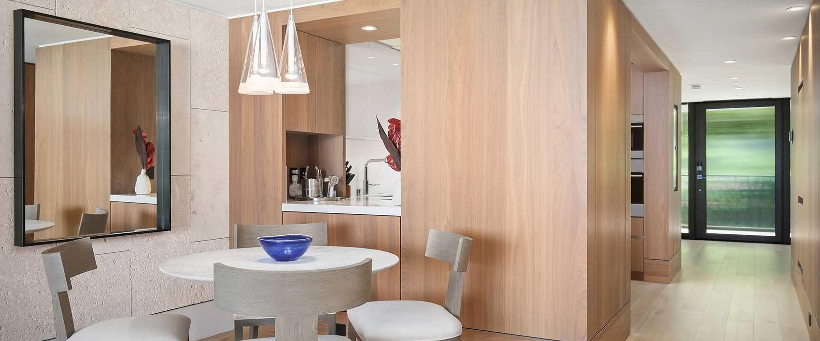This unit also includes a fully equipped chef’s kitchen with Wolf, Sub-Zero, and Miele appliances. The master and living rooms each offer a desk for those that need to work remotely. An Asko washer/dryer, central air conditioning, and complimentary high-speed WiFi (> 100Mbps up/down) create all the comforts of home. For entertainment, the living room includes an 85” Samsung Smart TV with multiple streaming services. The master and second suite each have the same TV model with 75” and 65” screens, respectively.