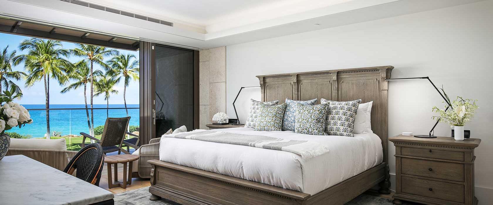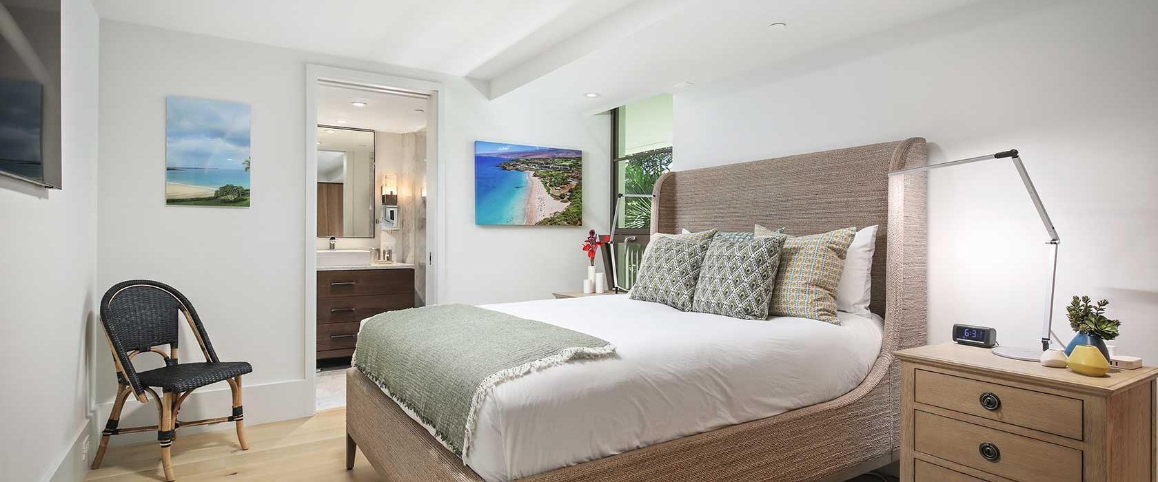 Enjoy unobstructed beachfront views in this modern, luxurious two-bedroom unit decorated with Restoration Hardware furniture throughout. Overlooking the white sandy beach, the living and master bedrooms feature floor-to-ceiling sliding glass walls that open to create an indoor-outdoor living space that includes a furnished lanai with dining for four and a lounging area for two. At night, sliding screens allow the master suite guests to drift asleep to the gentle crash of ocean waves while enjoying the comfort of a king-size, handcrafted Aireloom mattress. In addition to a walk-in closet with a dresser, the master suite includes an oversized marble bath with a soaking tub, rain shower, and Toto bidet. The second suite includes a queen-size Aireloom mattress with a private, full bath that includes a rain shower and a Toto bidet toilet. With its attached bath and separation from the living area, the second suite is naturally private.