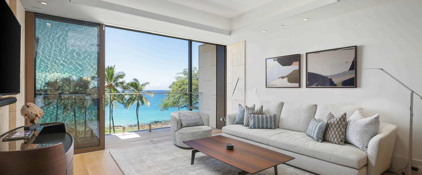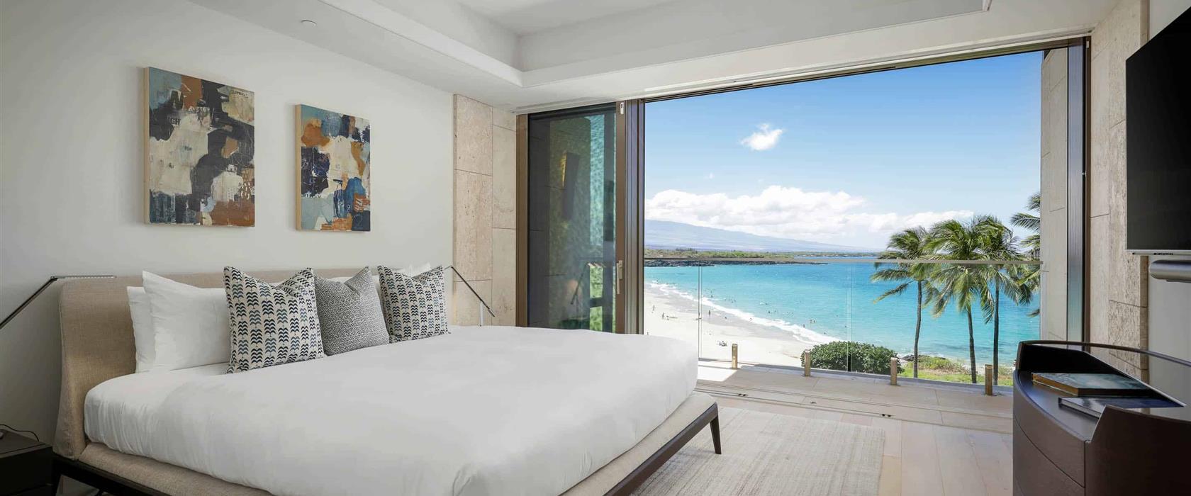 This dazzling, oceanfront, newly-constructed, island masterpiece offers floor-to-ceiling window walls that create indoor/outdoor living space, an epicurean kitchen with Wolf and Sub-Zero appliances, wine storage and hand-crafted cabinetry, plus a dining table for four. Additional features include dual guest suites, each with an opulent, attached bathroom (primary has a king size bed, secondary has a queen size bed), hardwood flooring, washer/dryer closet, and air-conditioning. This residence is steps from the Hapuna Golf Course Clubhouse.