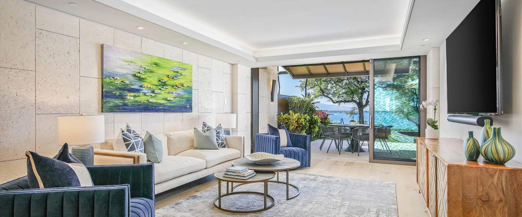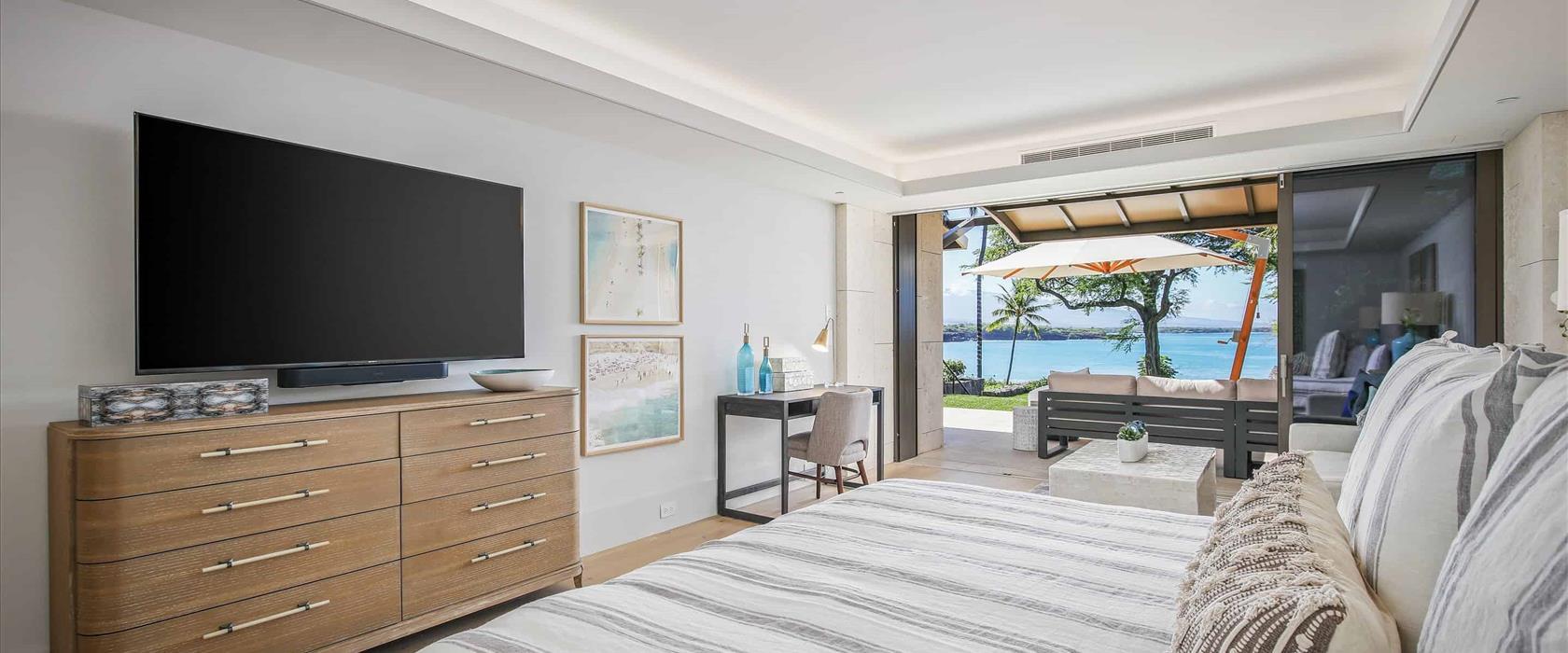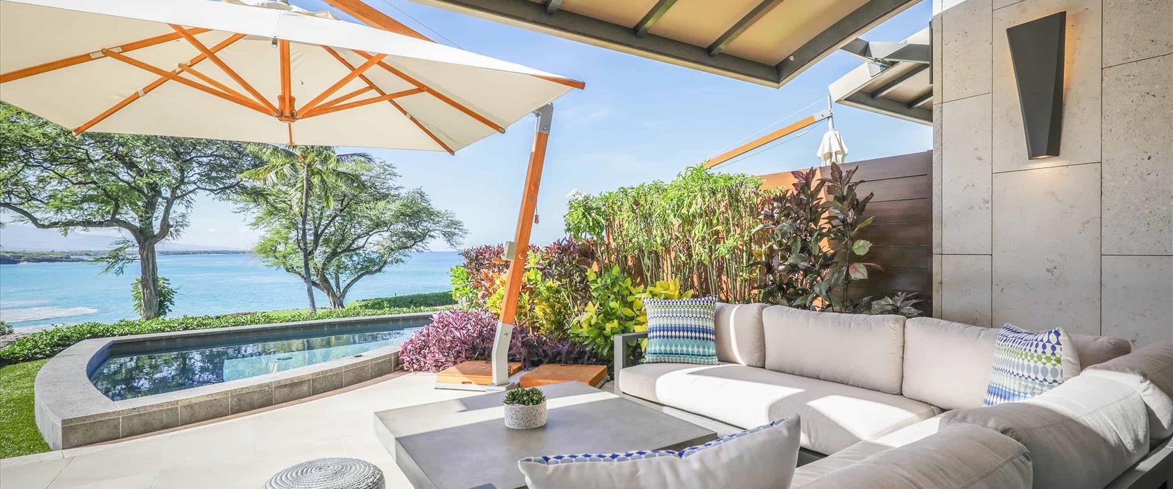 This oceanfront, newly-constructed, island masterpiece offers floor-to-ceiling sliding window walls that create indoor/outdoor living space, a gourmet kitchen with Wolf and Sub-Zero appliances, custom cabinetry and lighting, plus a dining table for six. Additional features include a grand master suite with a king size bed, desk/work space, sitting area and attached, spa-inspired bathroom, a guest bedroom with a queen size bed and garden view, a den/bonus room with sleeper sofa, air conditioning, washer/dryer, a private plunge pool, and a superbly-furnished lanai overlooking the ocean. This residence is steps from the Hapuna Golf Course Clubhouse.