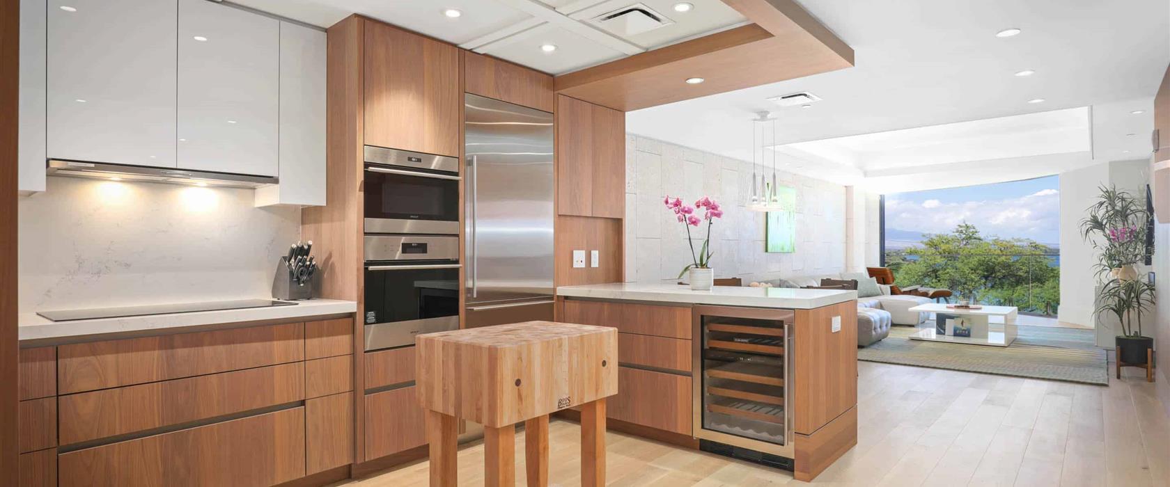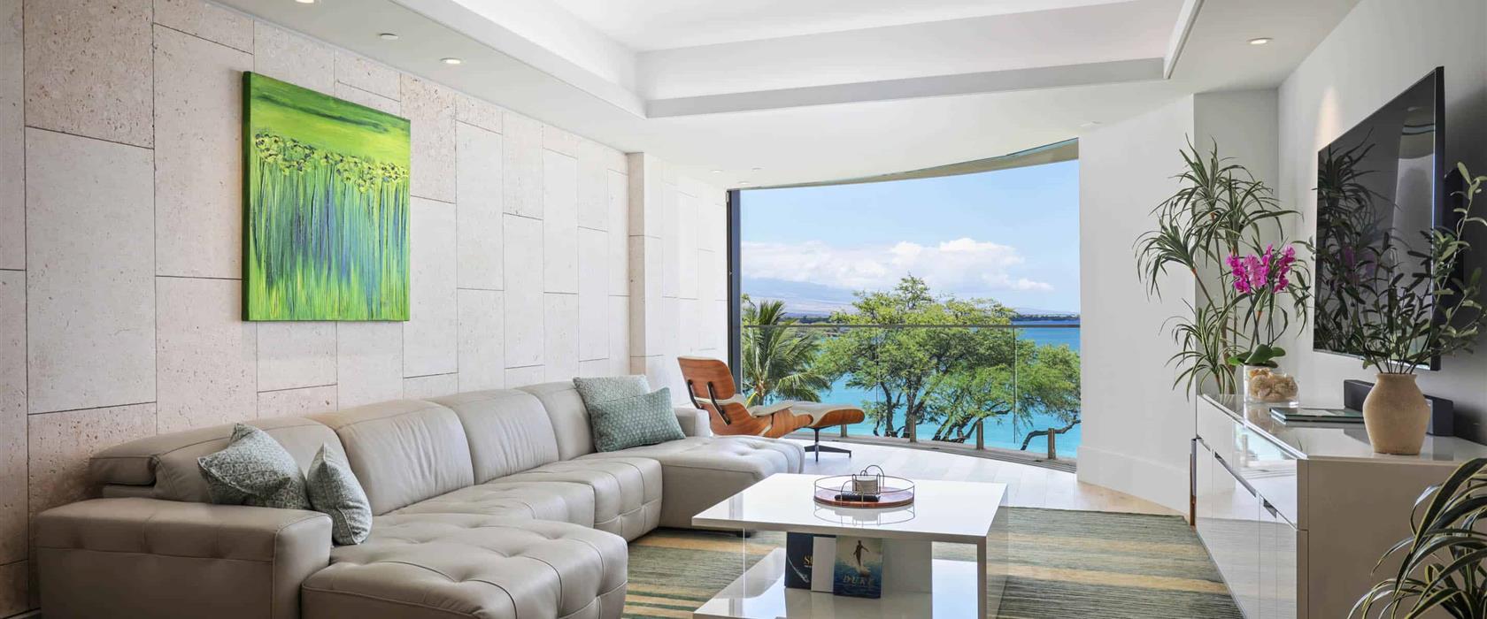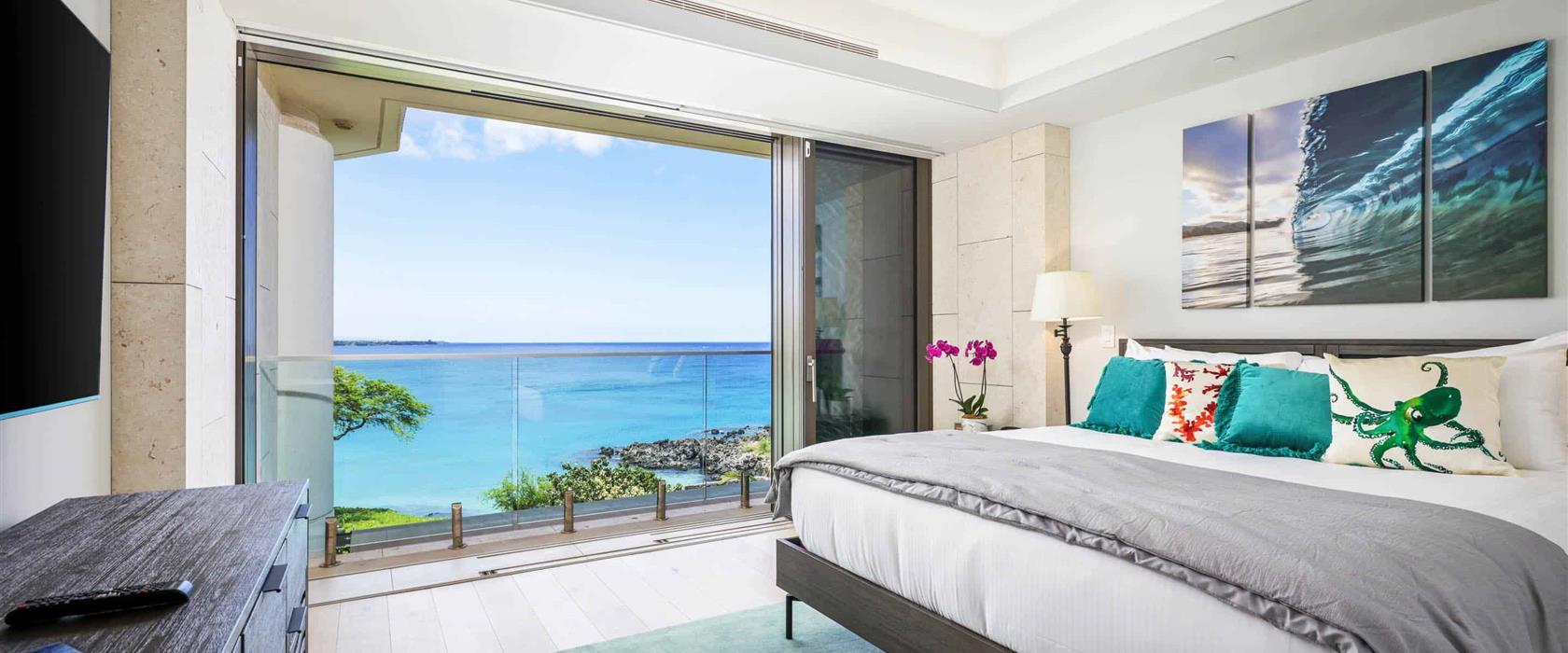 This marvelous, oceanfront, fourth floor, newly-constructed island masterpiece offers sliding glass pocket doors that create indoor/outdoor living space, a superior kitchen outfitted with professional-grade Wolf and Sub-Zero appliances, a wine refrigerator, butcher block island, and a marble dining table for four. Additional features include dual guest suites with Cal King size beds, each with a luxurious, attached bathroom, air conditioning, and a stacked washer/dryer. Guests will enjoy the private and quiet corner location of this residence while still being a short walk to the Hapuna Golf Course Clubhouse and beach access.