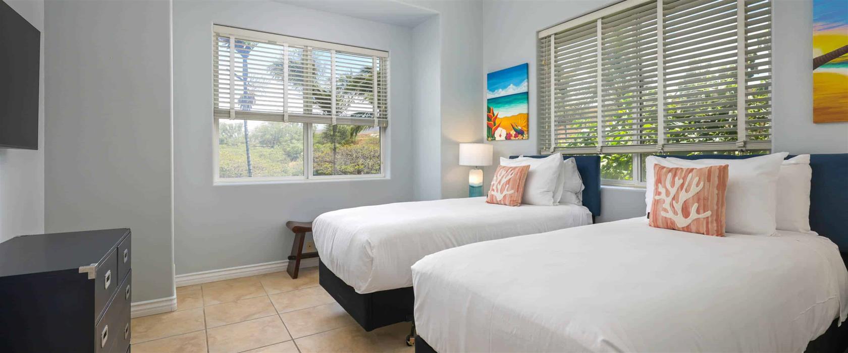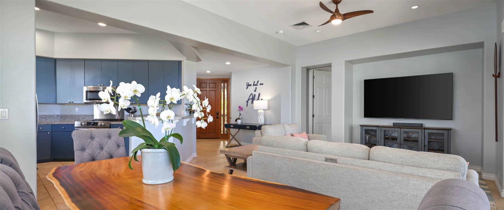 This upper-level, oceanview residence, lovingly coined “You had me at Aloha”, offers a great room with a sleeper sofa and sliding glass doors for indoor/outdoor island living; a chef’s kitchen with premium stainless steel appliances and granite countertops; plus a live-edge dining table for six. Additional features include: dual guest suites, each with flatscreen TV and well-appointed, attached bathroom (primary has a king size bed and soaking tub, secondary has two XL twin beds that can be converted into a king), air conditioning and ceiling fans, a washer/dryer closet, and one-car garage brimming with water toys, folding chairs, a cooler and utility wagon—everything needed for the perfect beach day. This residence is about one mile from the ocean.