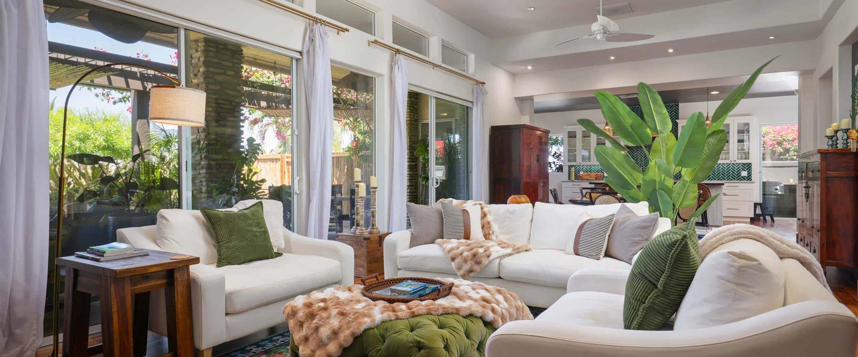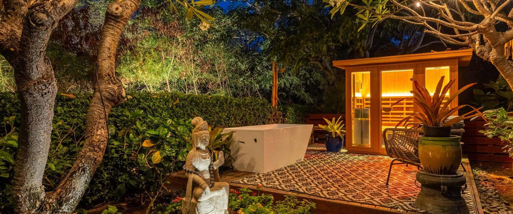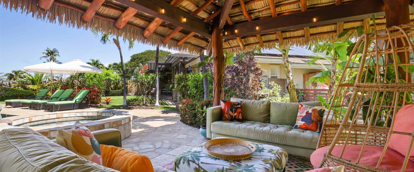 Rest and recharge in this luxurious four-bedroom, four-bath island retreat, where indoor comfort meets stunning outdoor living. The open-concept kitchen and living area flow seamlessly onto a spacious, furnished lanai, perfect for enjoying the coastal breeze. Step outside to your own private spa oasis featuring a pool, hot tub, cold plunge, and a serene sauna—all surrounded by lush greenery and plenty of comfortable seating for lounging or entertaining. Inside, the primary suite offers a king bed and spa-like ensuite with a soaking tub and walk-in shower, while two additional bedrooms feature queen beds. The detached Ohana suite provides added privacy with a king bed, its own ensuite, and a cozy mini living room. Additional comforts include air conditioning and in-unit laundry, making this home a perfect escape for rest, relaxation, and island-style living.