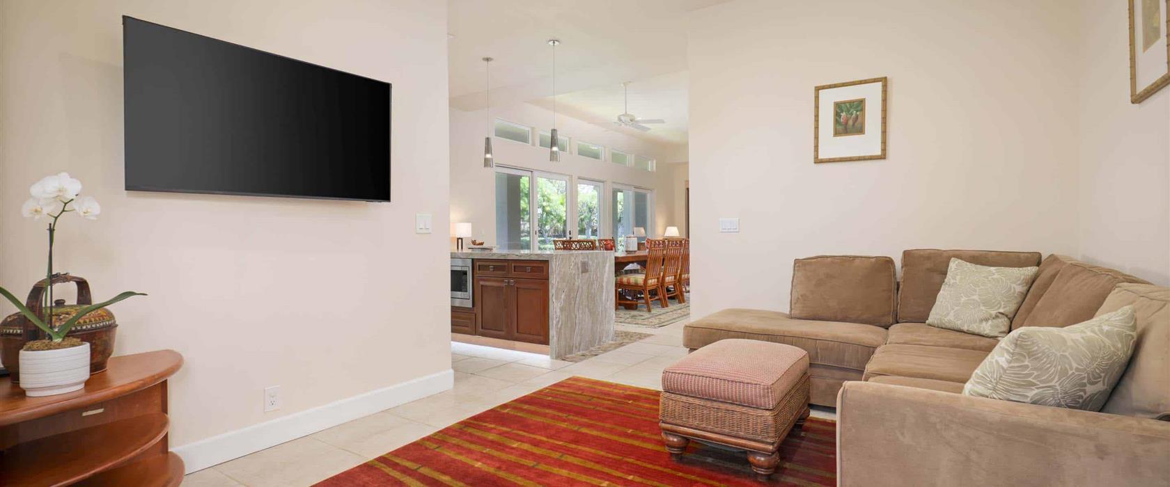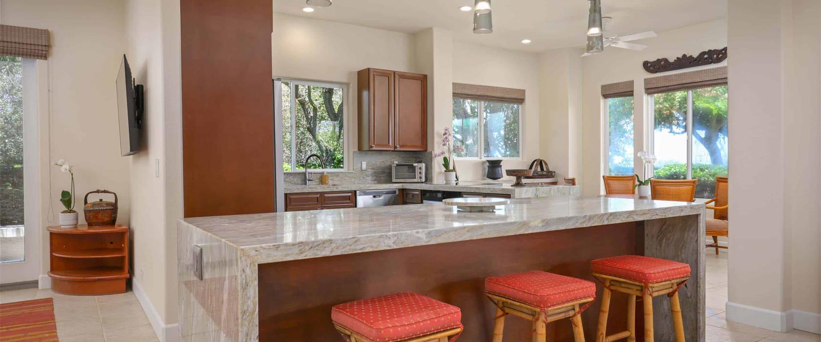 This elegant residence offers rare privacy and quiet while overlooking the beautifully redesigned Mauna Kea Golf Course by Robert Trent Jones, Jr., with breathtaking, unobstructed views of the Pacific, the Haleakala volcano on nearby Maui, and the Kohala Coast. The furnishings, curated by the renowned Hawaii interior designer Mary Philpotts McGrath, were carefully selected from the far reaches of Oceania and Asia. Enjoy the contemporary kitchen with elegant stone countertops and state-of-the-art Terra Kaffe automatic hot beverage dispenser, an adjacent outdoor BBQ area, a convenient breakfast nook, a large lanai for dining and lounging with expansive ocean, golf course, and sunset views, and a great room encompassing living, dining, and kitchen areas that enhance a sense of space and connection—perfect for entertaining or relaxing with family and friends. The master bedroom suite offers a peaceful escape with a king-size bed and a private ensuite bathroom, while the additional two bedrooms provide flexibility with two twin beds (convertible into a king bed) in one and a queen bed in the other. A sleeper sofa bed adds extra accommodation options. The energy-efficient Bosch air conditioner keeps the entire home cool and comfortable year-round. This Hawaiian residence combines tasteful design with stunning views, and is surrounded by lush, well-manicured tropical flora, including coconut, plumeria, hibiscus, bird-of-paradise, bougainvillea, firecracker, strawberry guava, shower trees, and more.