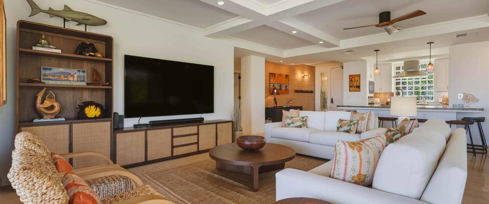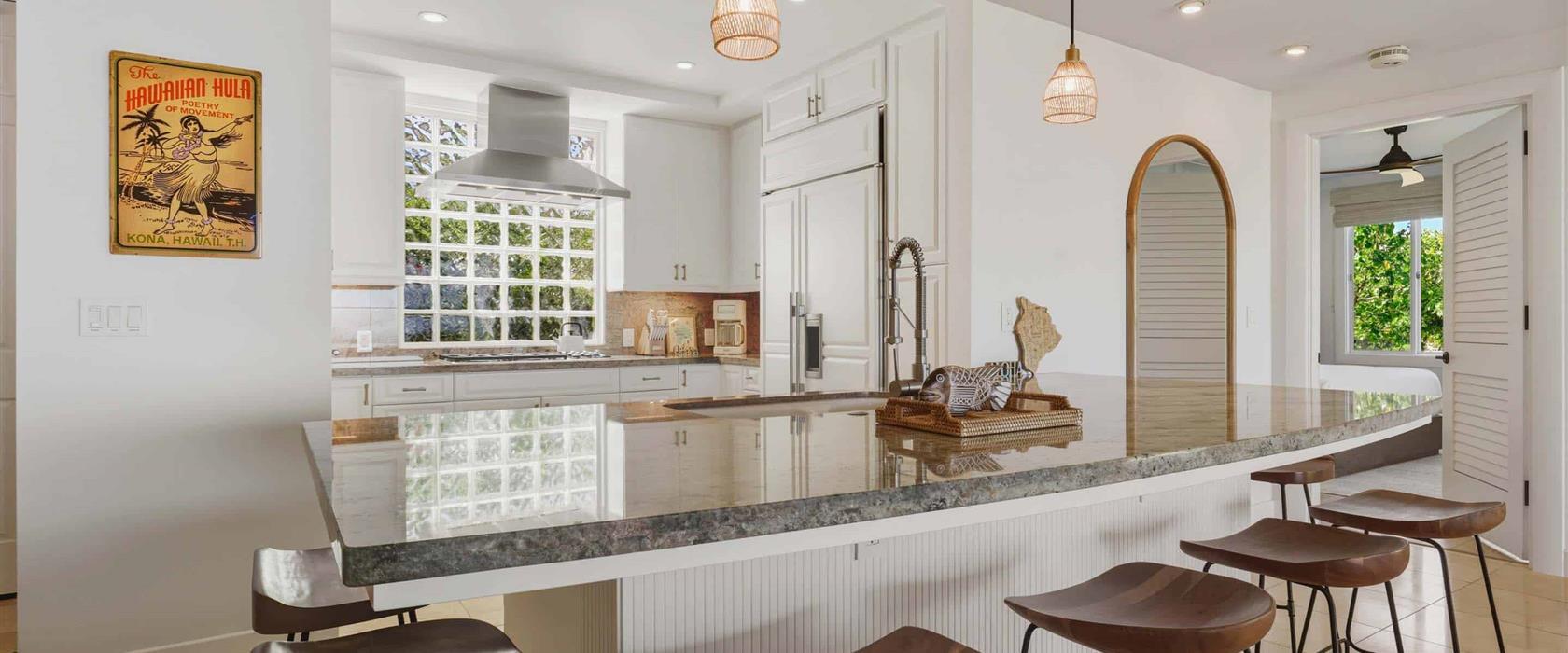 Perched in the uplands of the prestigious Mauna Kea Resort, this stunning villa offers sweeping views of the Kohala Coast, where breathtaking sunsets and lush golf course vistas create an unforgettable backdrop. Designed for seamless indoor-outdoor living, the home features an expansive covered lanai with ample seating and an open-concept living space—perfect for relaxing or entertaining. Inside, the inviting living room opens to a fully equipped kitchen and bar area with seating for eight, making hosting effortless. The villa offers three beautifully appointed suites: the primary suite includes a king-size bed, spa tub, and separate walk-in shower; the second suite features a king-size bed, dual vanity, soaking tub, and large walk-in shower; and the third bedroom provides flexibility with a king bed and twin bunk, plus access to a full hallway bathroom with a walk-in shower. Additional amenities include a laundry room, air conditioning, and ceiling fans throughout, ensuring comfort and convenience in this luxurious island retreat.